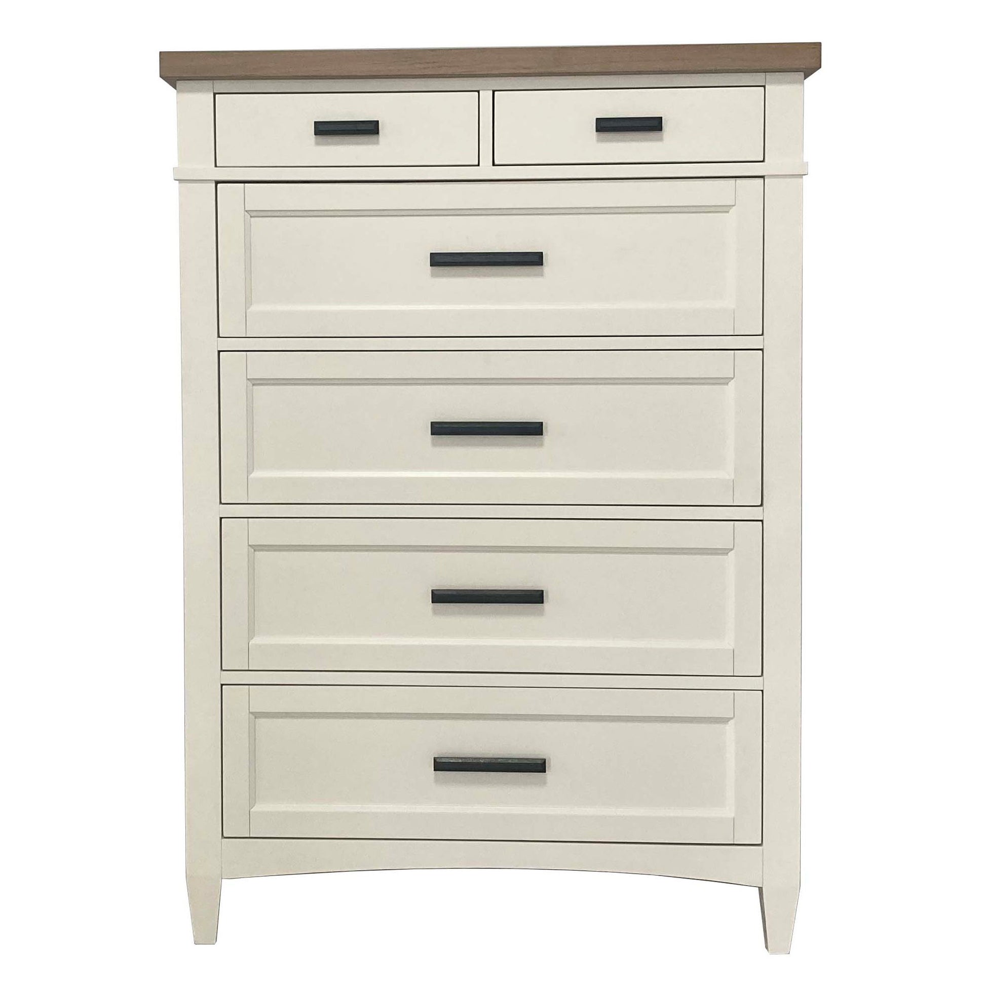 This piece is expertly crafted from poplar solids and birch veneers with and oak veneer top and boasts a fresh, hand-painted cotton finish with a contrasting weathered natural top that exudes timeless charm. Solid-metal custom hardware in and authentic burnished bronze finish adds a touch of elegance to this piece. The tapered legs create and eye-catching silhouette, making this chest and elegant and functional addition to any bedroom. This chest pairs beautifully with Americana Modern beds, making it the perfect addition to your bedroom décor.