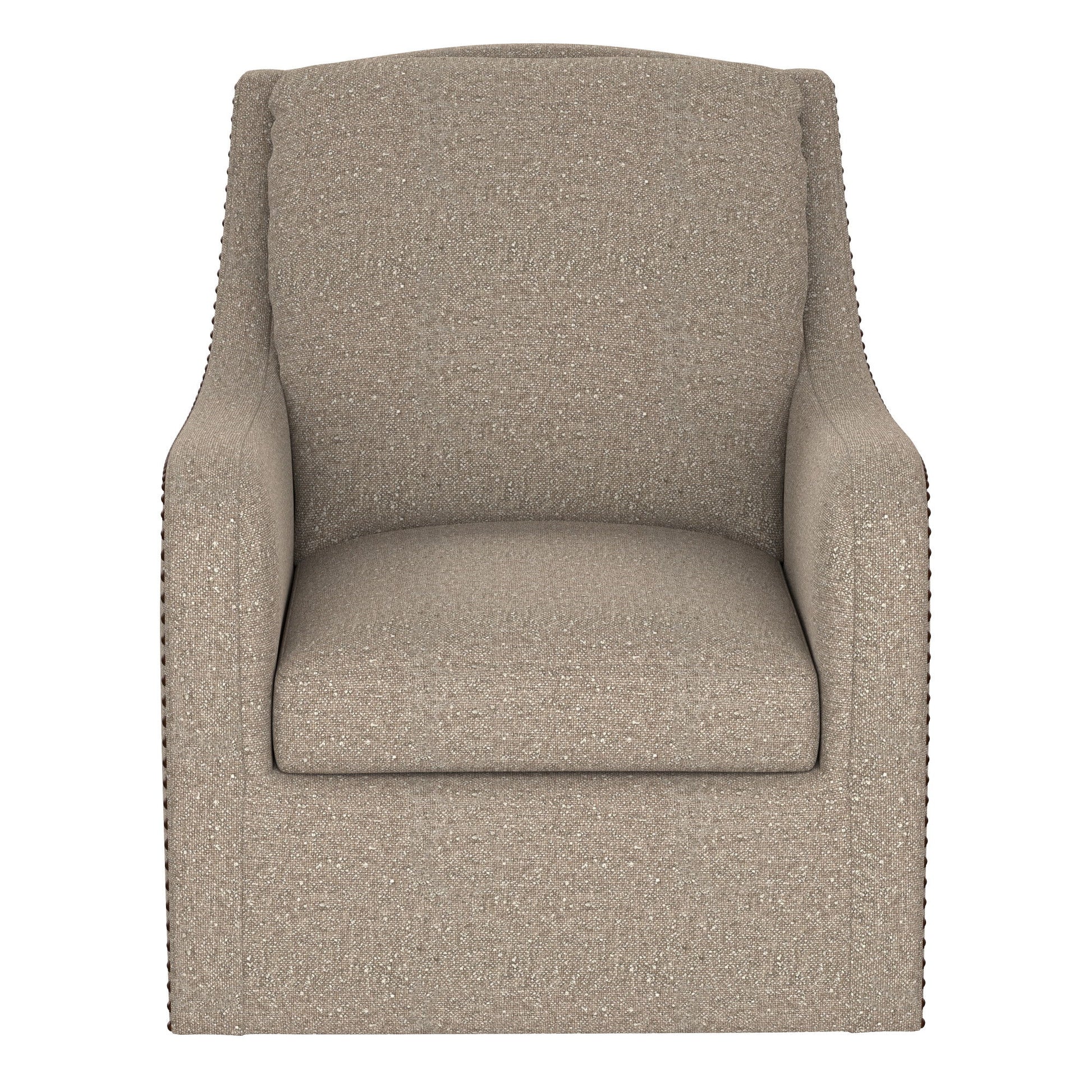Like a cool breeze on a warm summer day, the Anna swivel chair will carry fresh life into your home. Dark gray individually set nail heads highlight its angled lines and curved arms, striking an attractive silhouette that complements any style from transitional to farmhouse to traditional. As you sink into the responsive support of individually pocketed coils on a sinuous spring base, you’ll enjoy the soft-to-touch taupe polyester fabric feathered through with lighter and darker shades. Relax against the plump back cushion, take a 360-degree turn, and enjoy the breeze.