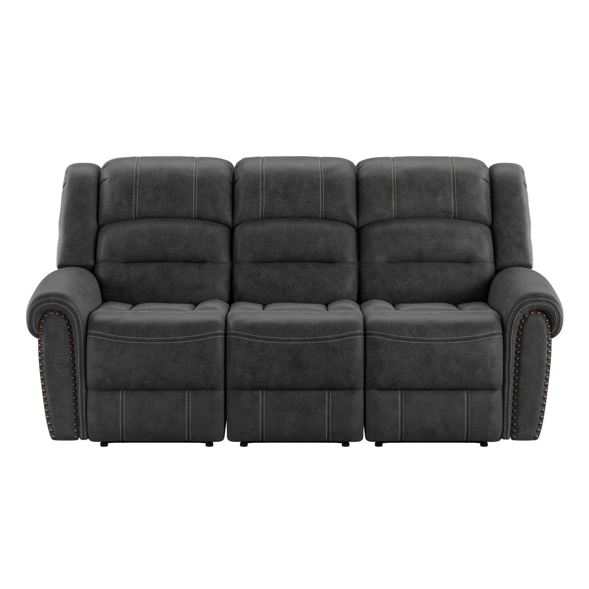 - The Baldwin reclining sofa presents rolled arms, nailhead trim, contrast baseball stitching, and weathered faux leather for an enhanced, yet comfortable look.