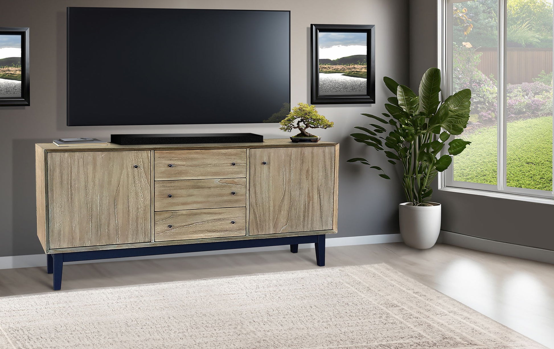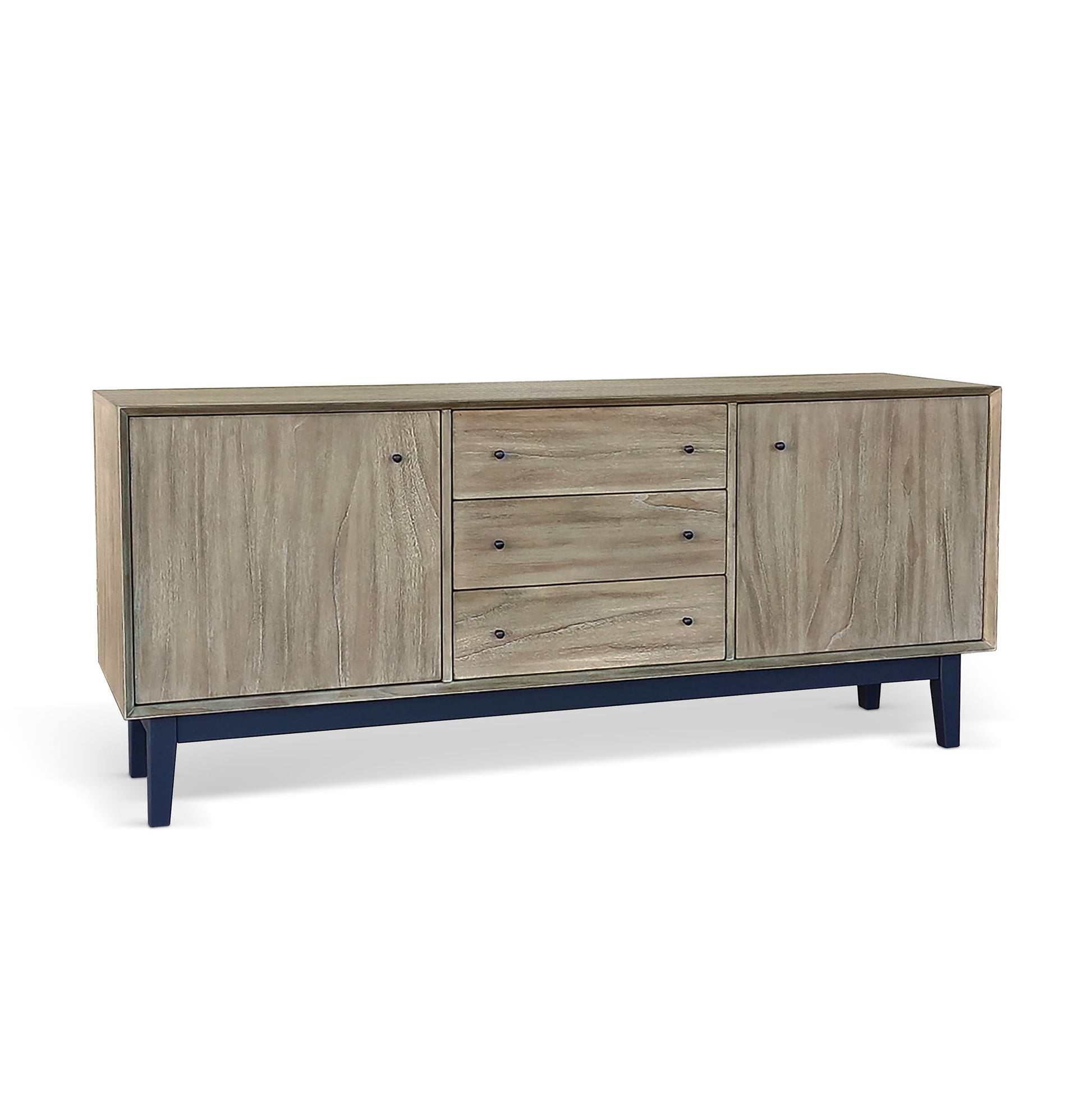 A stunning and versatile addition to your dining or living space that seamlessly combines style with practicality. Crafted with meticulous attention to detail, the two-tone design beautifully showcases the natural woodgrain, creating a visually captivating piece. The warm wheat tone on the top and sides elegantly contrasts with the bold black finish on the base, adding a modern flair to the classic wood aesthetic. This server features three drawers for convenient storage and two cabinets with adjustable shelves, providing ample space to organize and display your essentials.