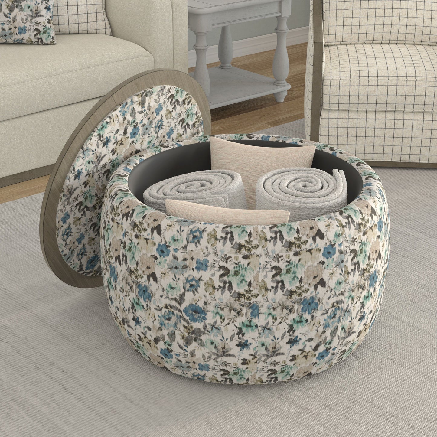 - The CECILY storage ottoman draws quiet attention with its balanced blend of structural and tailored shapes and gray solid wood trim.