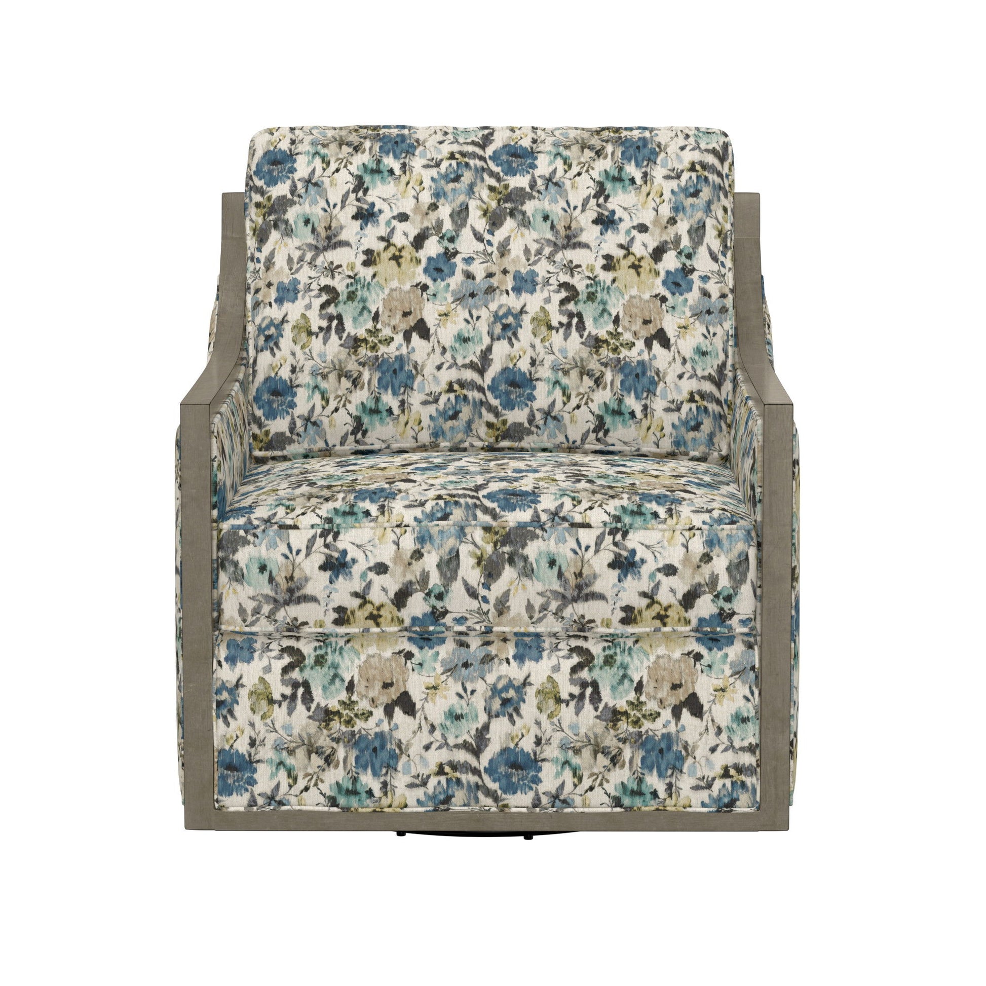 - The Cecily swivel chair draws quiet attention with its balanced blend of structural and tailored shapes and gray solid wood trim.