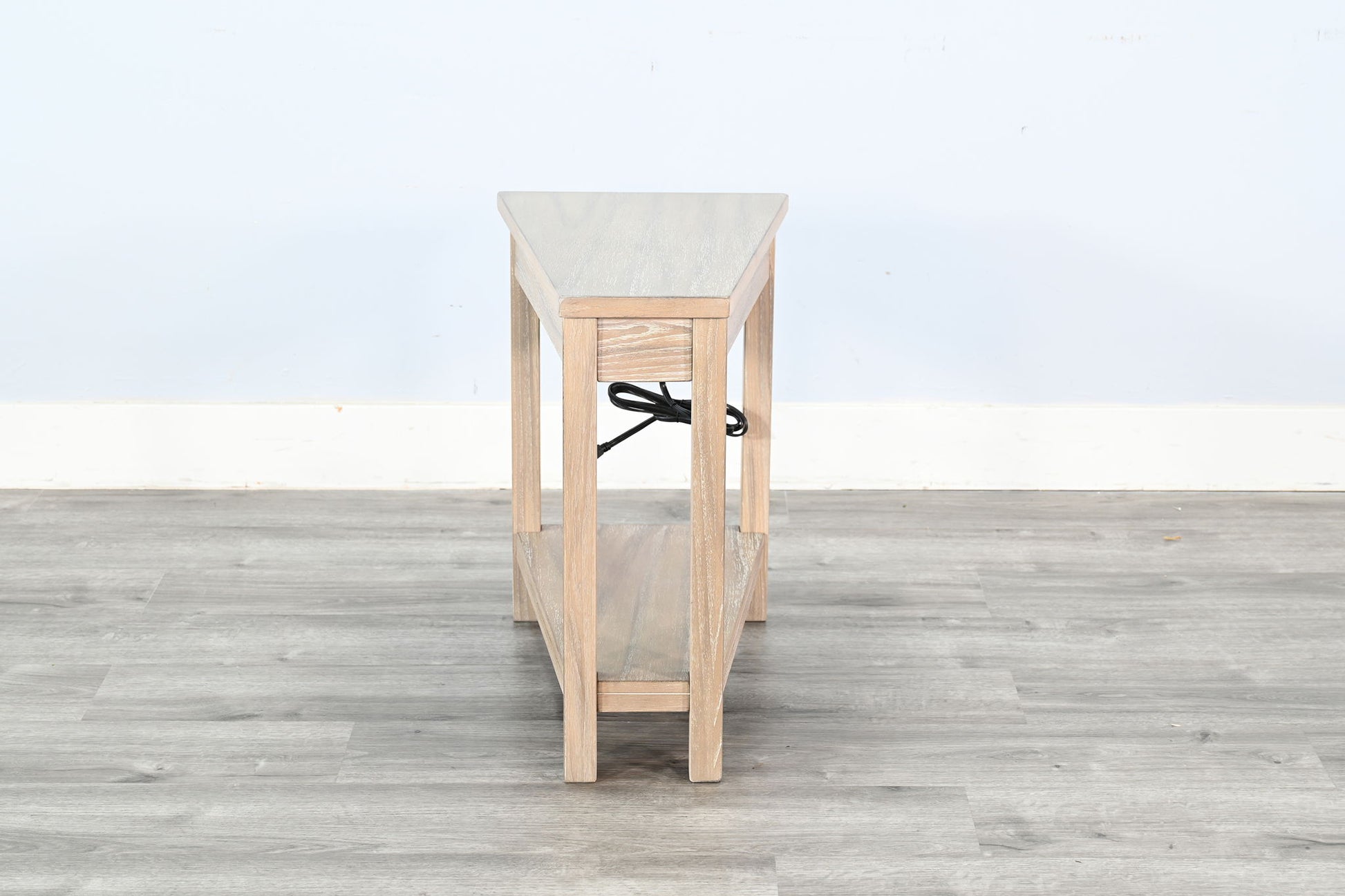Whether set chairside, next to your sofa, or pulled up to your bedside for a distinctive nightstand, this chairside wedge table is an excellent addition to any ensemble. This simple design offers one open lower shelf that is perfect for accent decor, stacking your go-to novels, or fanning out your favorite magazines. Additionally, it features an integrated power strip, making it easy to keep your devices charged and within reach.