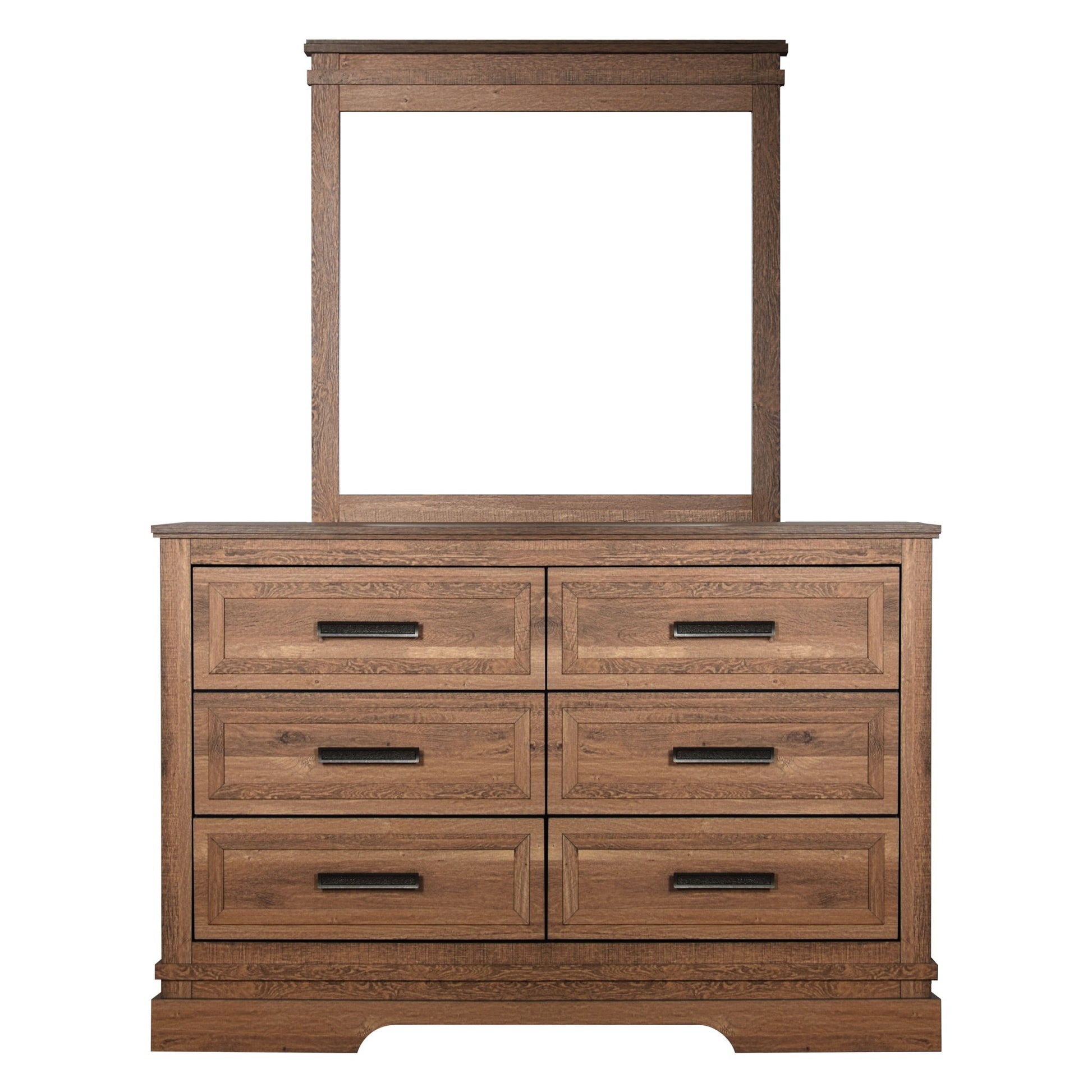 The Coventry Hall Dresser in Pecan combines durability and style, making it a standout piece for any bedroom. Made from high-quality manufactured woods and topped with eco-friendly decorative laminate, this dresser offers a robust and stable storage solution. Its modern rustic design harmoniously blends the warmth and texture of natural wood with clean lines and minimalism, providing a versatile aesthetic that fits various decor styles. The eco-friendly laminate not only mimics the natural look of wood but also resists scratches, stains, and moisture, ensuring lasting beauty and functionality. With features such as clean lines, picture frame moldings, bracket feet, and contrasting hardware, the dresser brings a contemporary touch to any space. The six spacious drawers, constructed with durable dovetail joinery and equipped with ball bearing glides, ensure smooth operation and ample storage for clothing. The Coventry Hall Dresser is a practical and stylish choice for anyone seeking a combination of elegance and functionality in their bedroom furniture.
