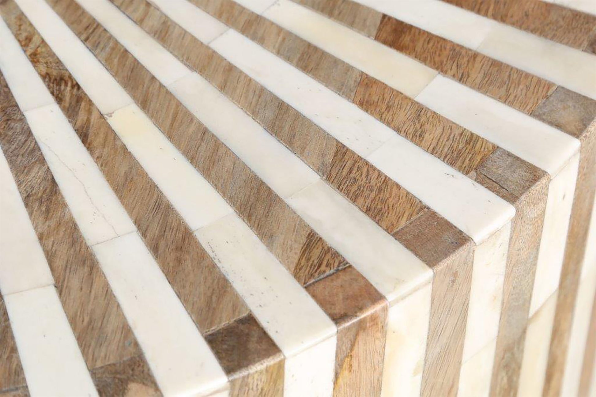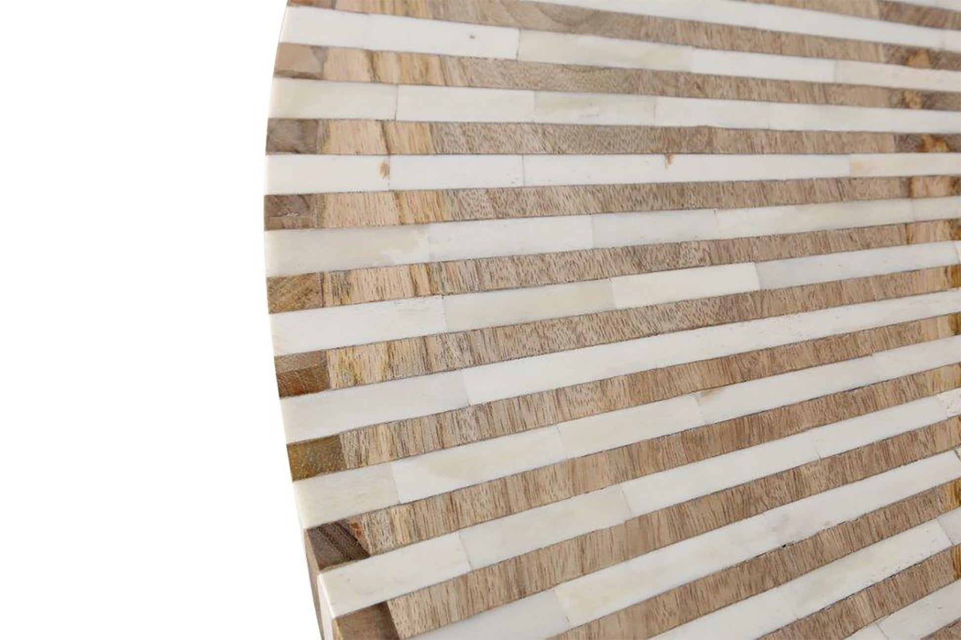 This round accent table offers a youthful, slightly Boho vibe. Organic yet refined this table is made from mango wood and bone inlay in a beautiful radial pattern.