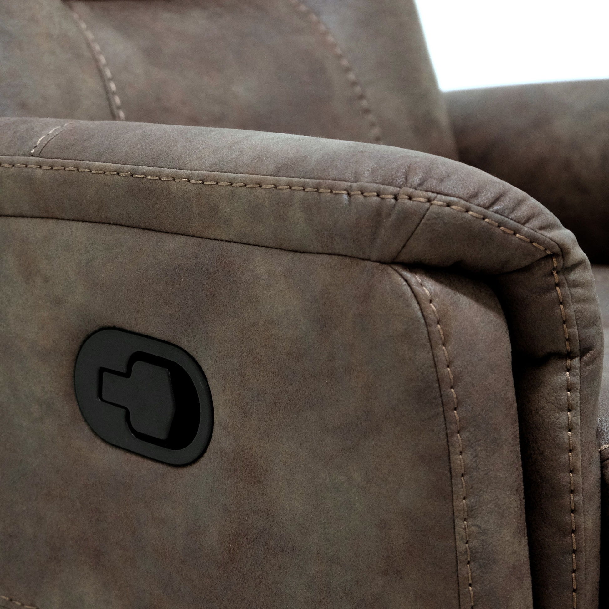 Easily refresh your home with the space-friendly, gliding recliner Danyon. This smaller-framed design is large in comfort with its deep seat and expertly placed back tufting. Contrast stitching wraps this piece to present a well-tailored look, while the padded arms will make you feel right at home. Revitalize with an easy pull of a lever to recline into soft, faux leather that reminds you to stay a while.