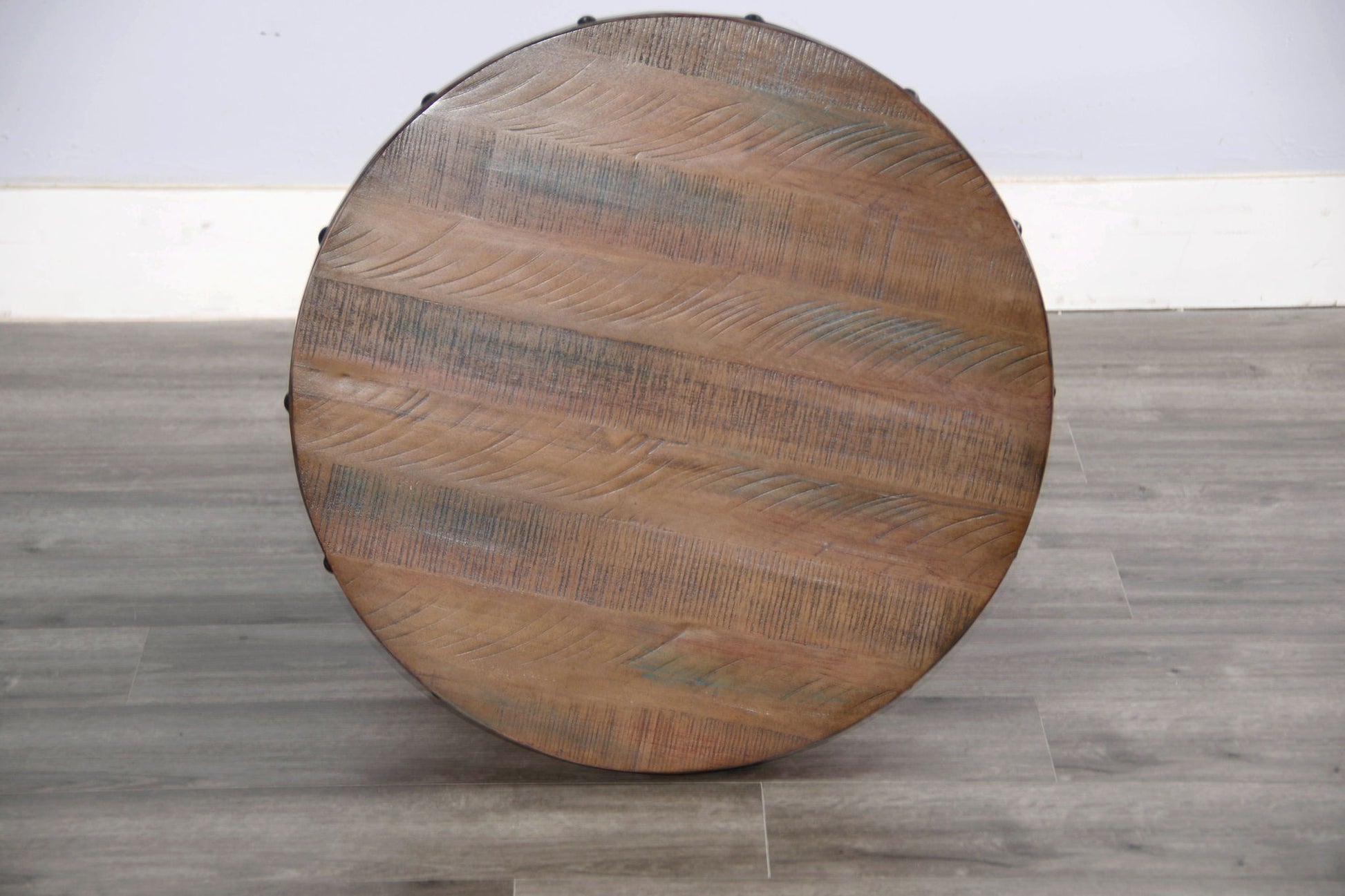 Introduce a touch of rustic charm and industrial flair to your living space with our Planked Wood Round Coffee Table featuring a striking metal rivets accent on top. Crafted with meticulous attention to detail, the table's planked wood surface exudes warmth and character, showcasing the natural beauty of the wood grain. The round silhouette adds a soft and inviting touch to your living room, while the metal rivets accent introduces an industrial edge that catches the eye.