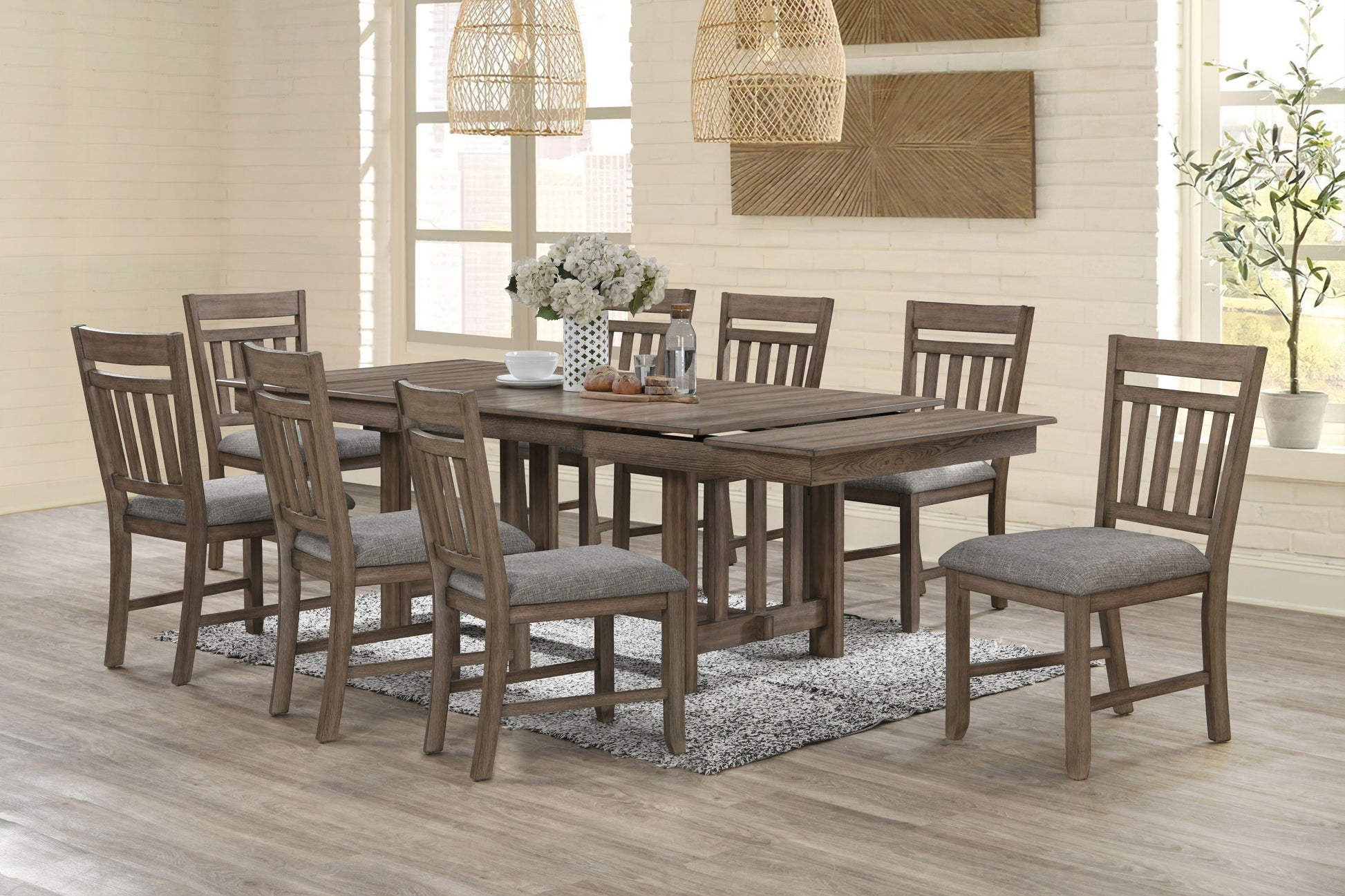 The Harrisburg Dining Set is the perfect centerpiece for your dining room, offering both style and functionality. Comprising a dining table and side chairs, this set features a robust construction of solid rubberwood, manufactured woods, and oak veneers, ensuring durability and longevity. The table''s rich finish is meticulously achieved through a detailed process of burnishing and glazing, enhancing the natural wood grain and creating a warm, inviting atmosphere. This family-sized dining set adapts to your needs with two 14-inch self-storing leaves, allowing the 66-inch table to extend up to 94 inches to comfortably accommodate 6 to 8 people. The chairs are equipped with high-density foam cushions wrapped in a 100% polyester easy-care fabric, providing both comfort and support. The heritage-style design of the dining set, featuring a traditional trestle table with a solid, pillared base and complementing slat-backed chairs, seamlessly blends elements of farmhouse, mission, and arts and crafts styles. This dining set is a practical choice for those who value both style and quality in their furniture.