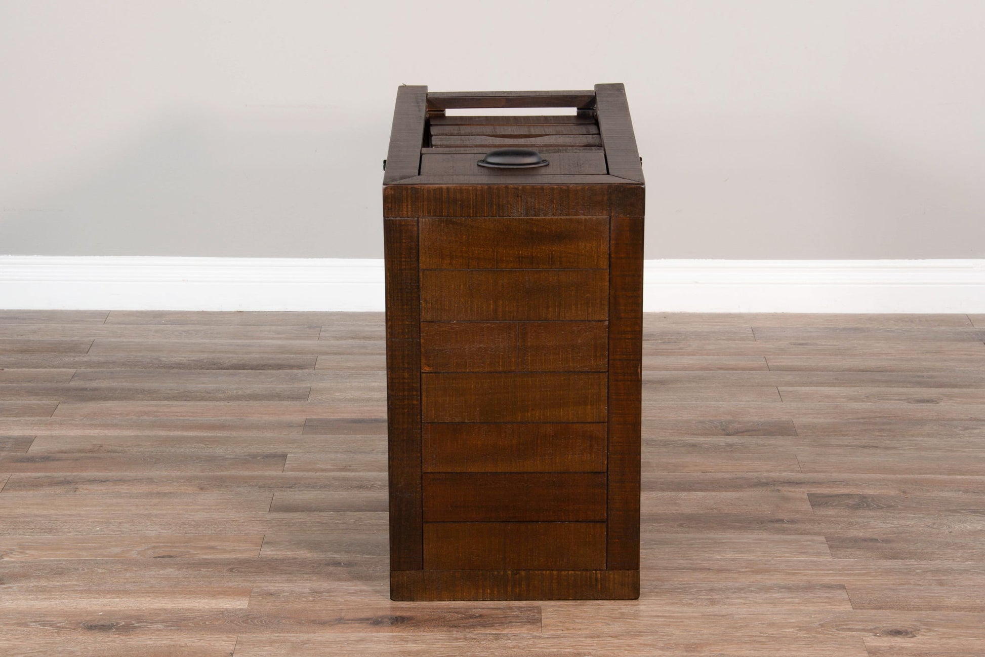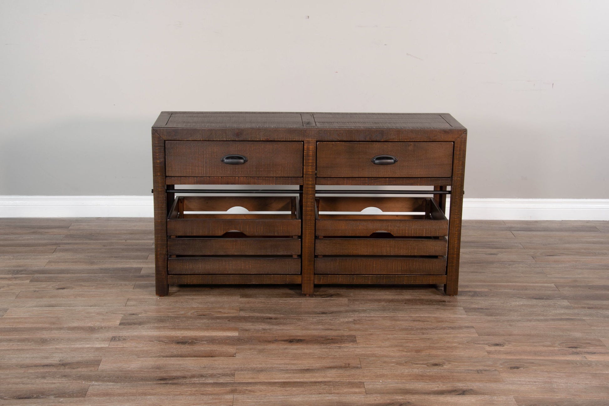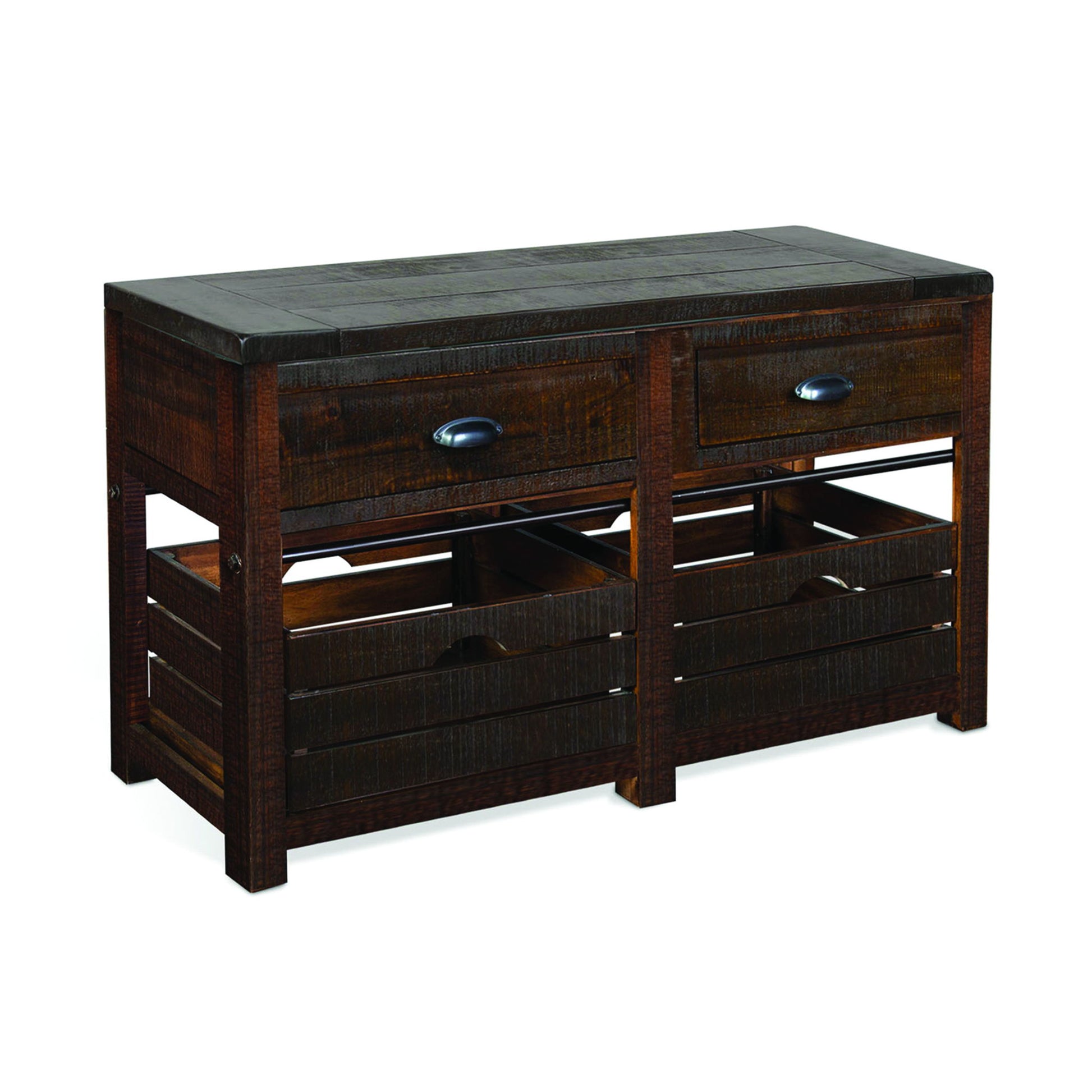 This Homestead table features a distressed, tobacco leaf finish that adds a hint of beauty and style to your living space. Made from mahogany solids and veneers, this table is strong and durable for long-lasting usage. The lower storage crates have full extension drawer guides and are removable. It also features nut head metal pipe accents and decorative hardware.