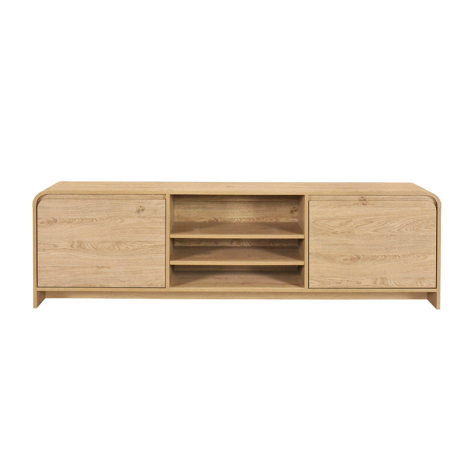 Introducing the Mara 70" TV Console, a fusion of eco-friendly construction and modern functionality. Crafted from durable manufactured wood and adorned with environmentally friendly laminate, this console boasts both durability and sustainability. With its spacious top surface, it accommodates large screen televisions with ease, while shelves offer ample space for entertainment components. Two roomy drawers discreetly store games, controllers, and other family room essentials. The minimalist design, featuring curved drawer fronts and waterfall-style tops and sides, adds a contemporary touch to any living space. Finished in a natural hue, it seamlessly complements a variety of décors. Assembly is a breeze, with easy-to-follow instructions for a hassle-free setup in approximately 45 minutes. Elevate your entertainment experience with the Mara 70" TV Console.
