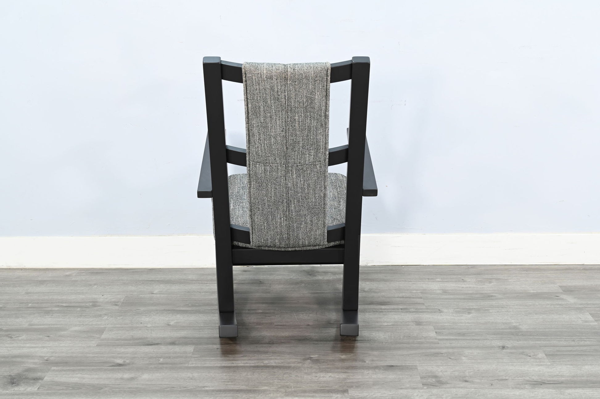 Experience ultimate relaxation with this beautifully crafted contemporary rocking chair, designed to blend both comfort and style. The sturdy black wooden frame provides a sleek, modern look, while the plush, gray upholstered cushions offer exceptional support for extended lounging. Whether you're reading a book, enjoying your morning coffee, or soothing a little one to sleep, the high backrest and padded seat ensure a cozy and comfortable experience.