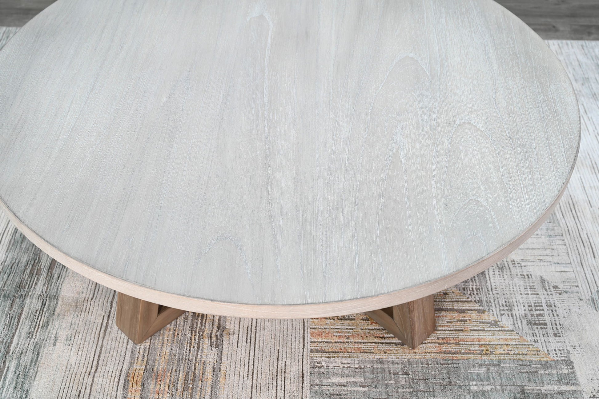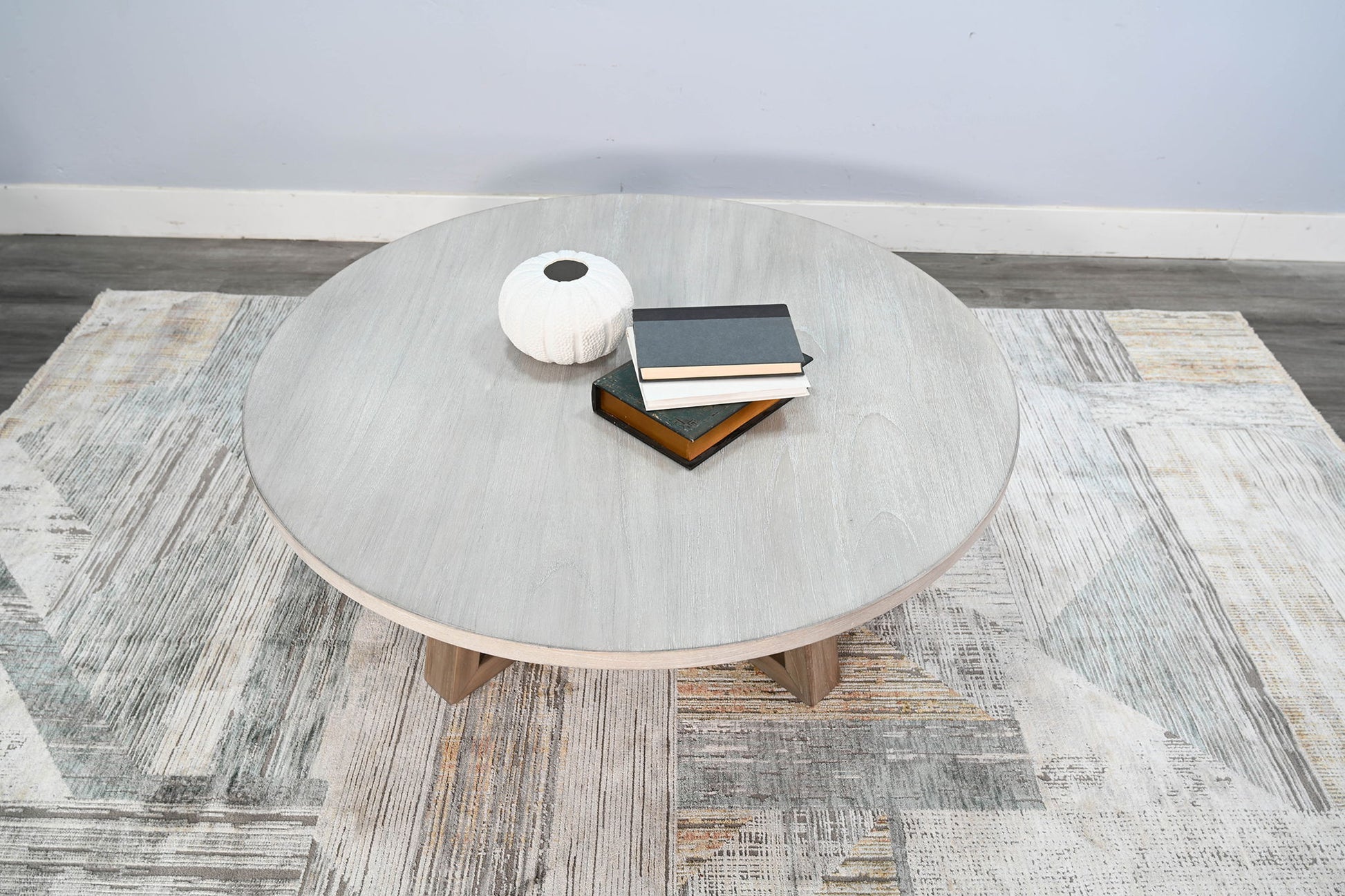 A perfect blend of contemporary style and natural warmth. The circular design softens the edges of your living space, creating an inviting centerpiece that encourages conversation and connection. The grey and wheat finish adds a touch of modern elegance to the wood, enhancing its grain and texture. Crafted with meticulous attention to detail, this coffee table features a smooth, expansive surface, providing ample room for your morning coffee, favorite reads, or decorative accents. The versatile color palette seamlessly integrates into a variety of interior styles, making it a versatile addition to your home.