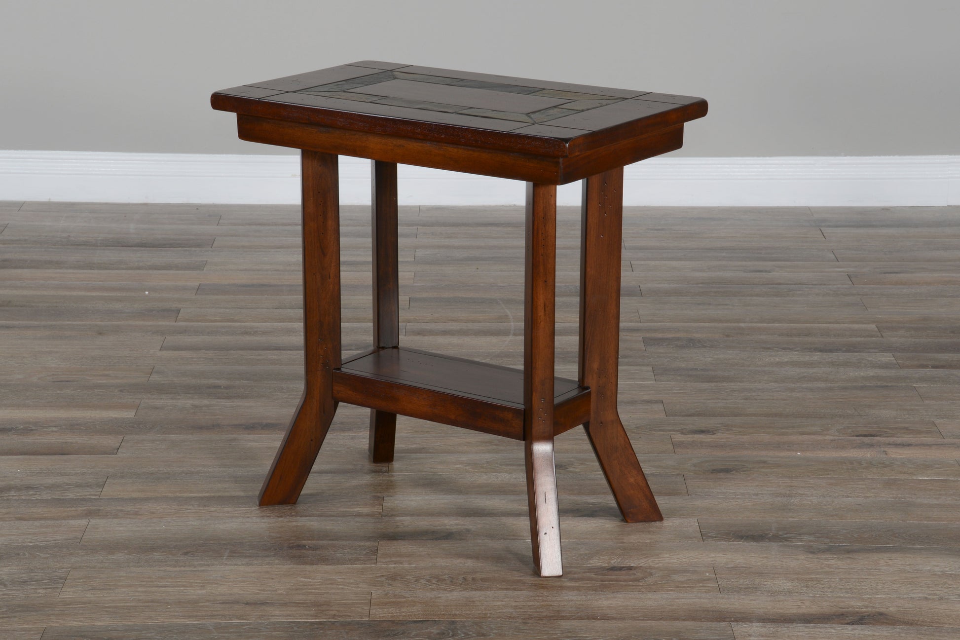 This Santa Fe Coffee Table with slate inlay is a traditional design that was crafted with distressed mahogany solids and veneers. The table has one storage shelf and the tabletop has beautiful slate inlays.