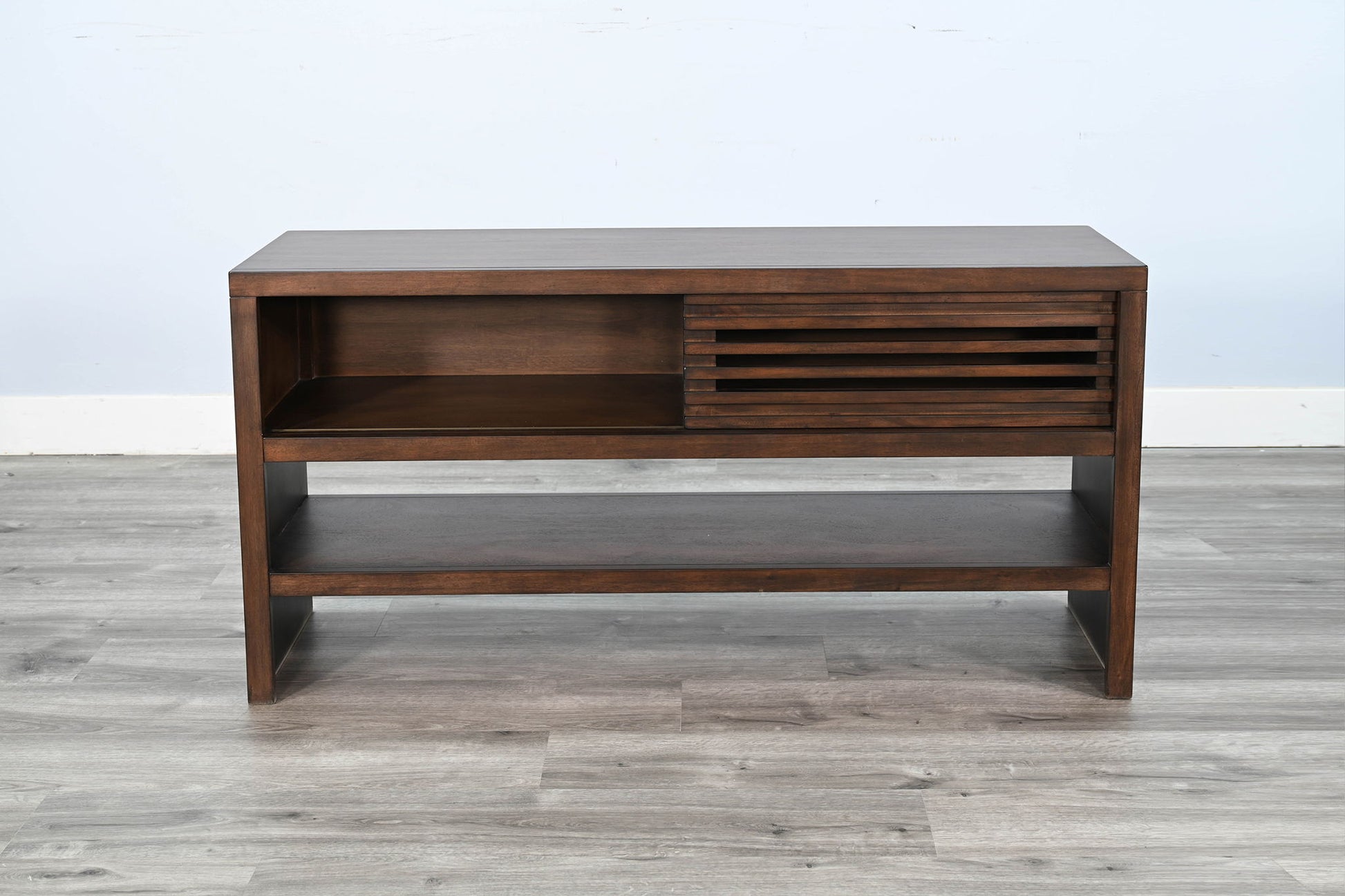 Introducing our distinctive sofa table, a statement piece that effortlessly merges functionality with contemporary design. Featuring a unique slatted design, this table captures attention with its modern aesthetic and artistic flair. The standout feature is the sliding door, seamlessly integrated to enhance both style and accessibility. Crafted with precision, the coffee table combines sleek lines and quality materials for a harmonious blend of form and function.