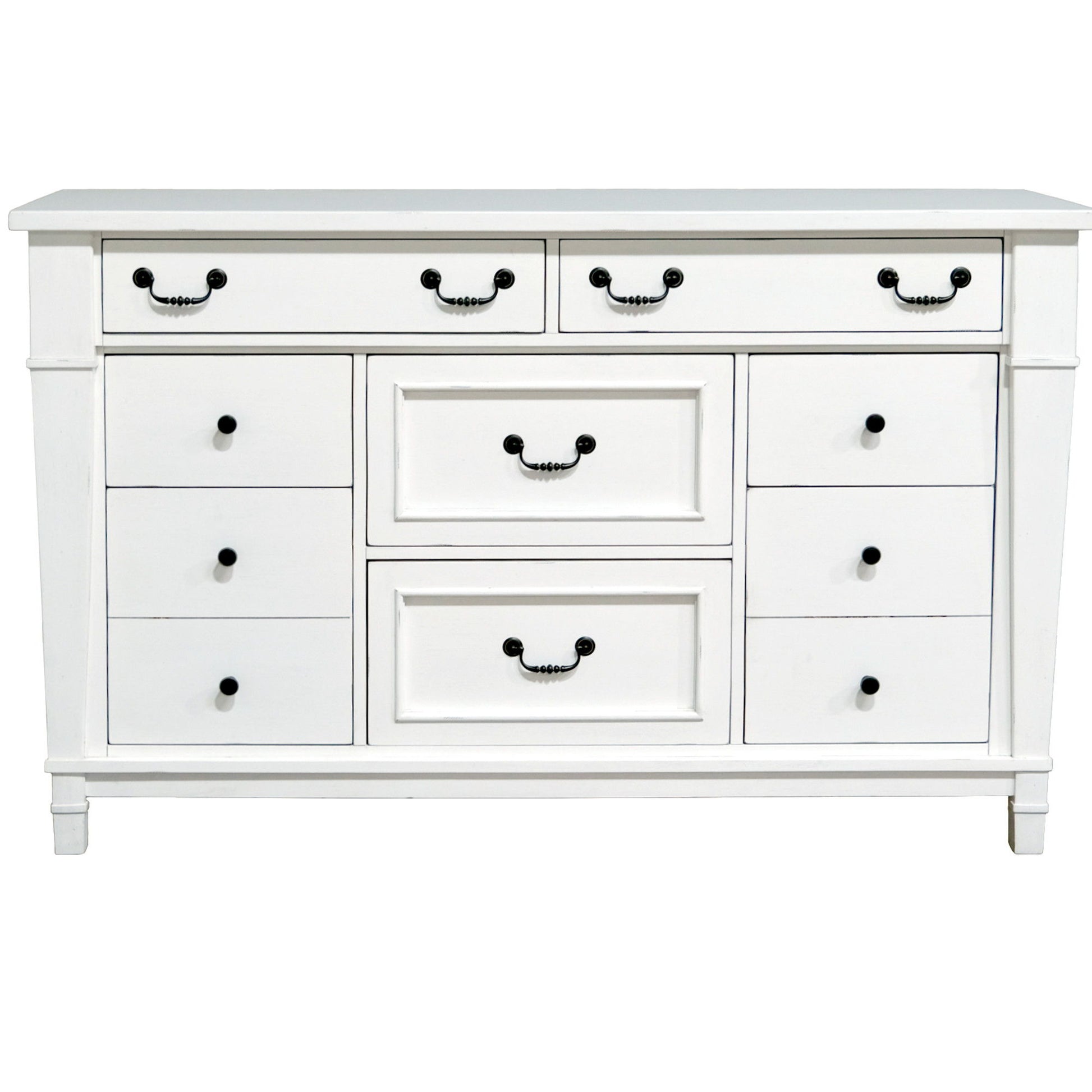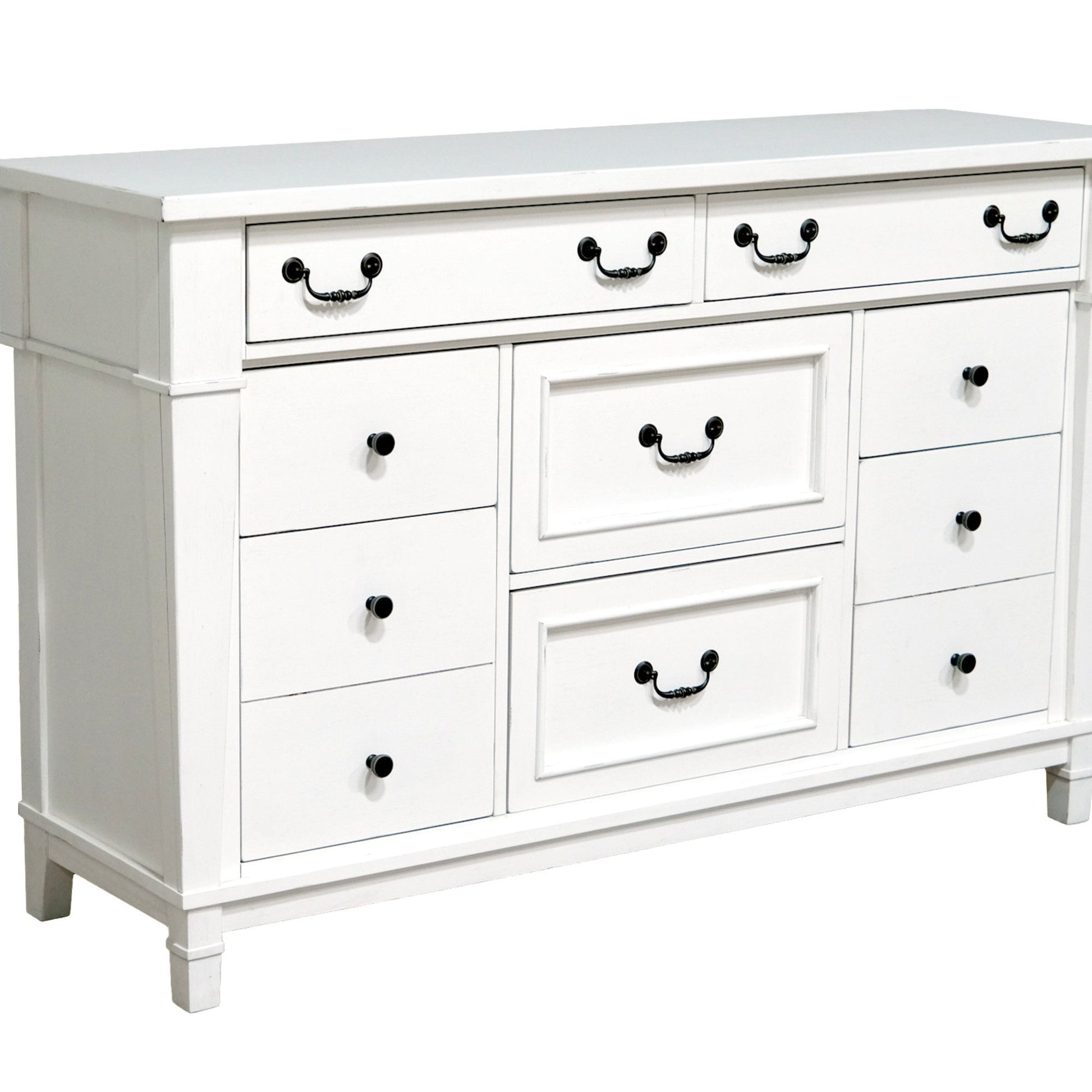 - The Stoney Creek 8-drawer dresser offers large-scale designs combined with a textured, antiqued white finish. Giving additional charm, the antiqued, blackened metal hardware and tapered leg details complete this relaxing retreat..