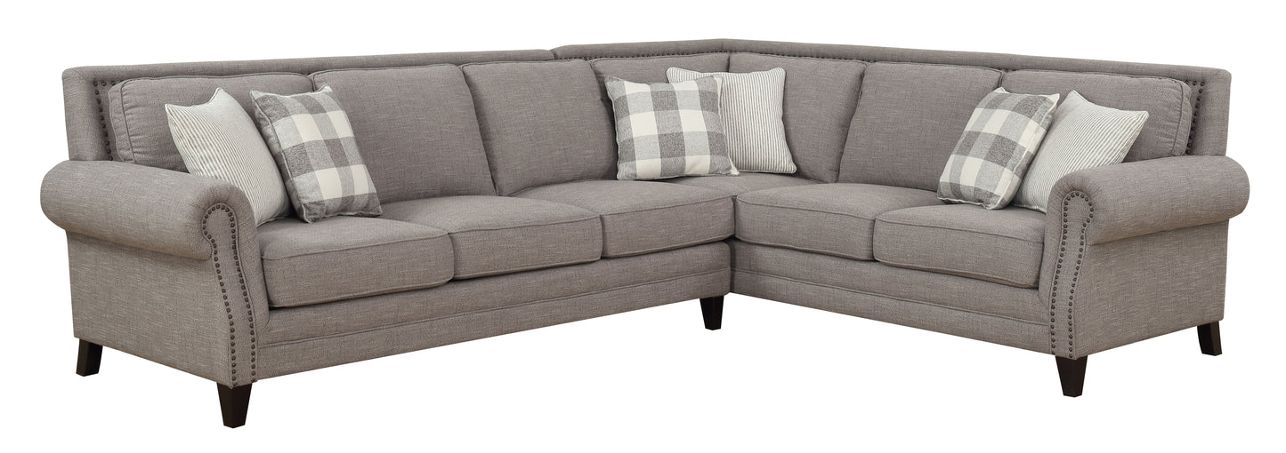 If your lifestyle is where traditional and country cottage meet, the Willow Creek collection is for you! Elegant features like nailhead trim, rolled arms on the sectional, soft gray gingham on the pushback chair, and wheeled ornamental feet on the round ottoman are clothed in the casual comfort of pebble brown and stripes. Give your home an easy update with the eclectic style of Willow Creek.